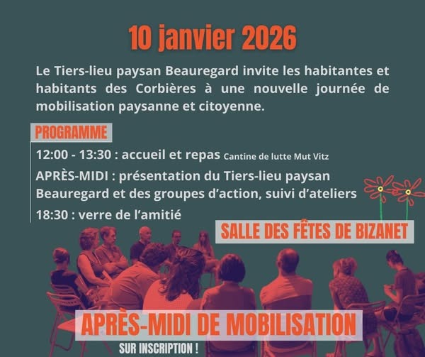 - suivre cet autre lien pour plus d’informations sur cette rencontre : https://www.beauregard-tlp.fr/events/journee-de-mobilisation-paysanne-et-citoyenne-a-bizanet/
