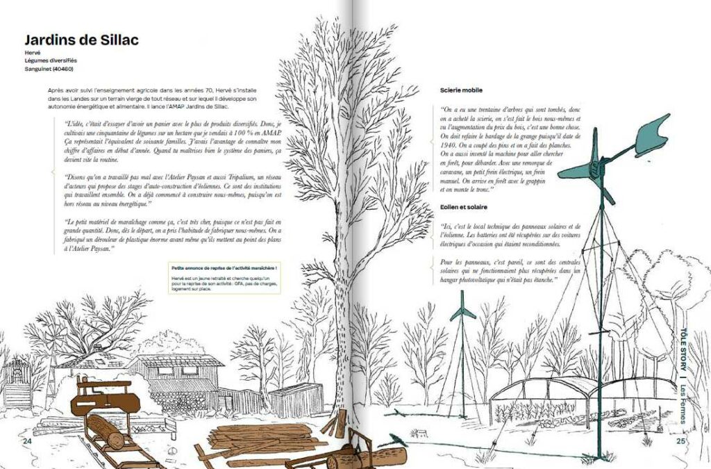 Autre actualité à ne pas rater : Tôle Story, recueil dont la sortie est imminente, que l’association a produit avec l’aide de Clément Mainguy à l’illustration. Sur ses 40 pages, l’ouvrage reprend les pérégrinations de La Smalah et de 14 fermes landaises dans leur chemin vers des fermes plus autonomes. On y croise les points de vue d’un producteur d’asperges ayant monté son atelier de ferronnier, de jeunes paysans et paysannes installé.e.s récemment, d’un pionnier de l’autonomie énergétique et même d’une classe de 2nd en Agroéquipement se construisant un Landoryphore.